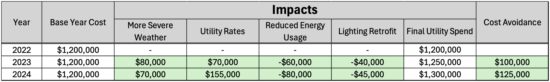 At first glance, reviewing the raw utility spend seemed to indicate that their initiatives had failed. Their annual utility spend actually increased by $100,000, rising from $1,200,000 to $1,300,000 over two years.