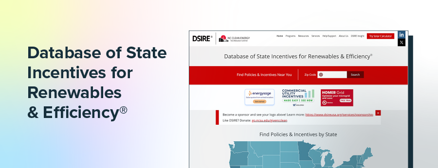 The Database of State Incentives for Renewables & Efficiency® (DSIRE) is a nationwide directory of policies and incentives that support renewable energy and energy efficiency across the United States. Since 1995, the N.C. Clean Energy Technology Center has operated it, helping you quickly find programs by state, territory, or federal level.