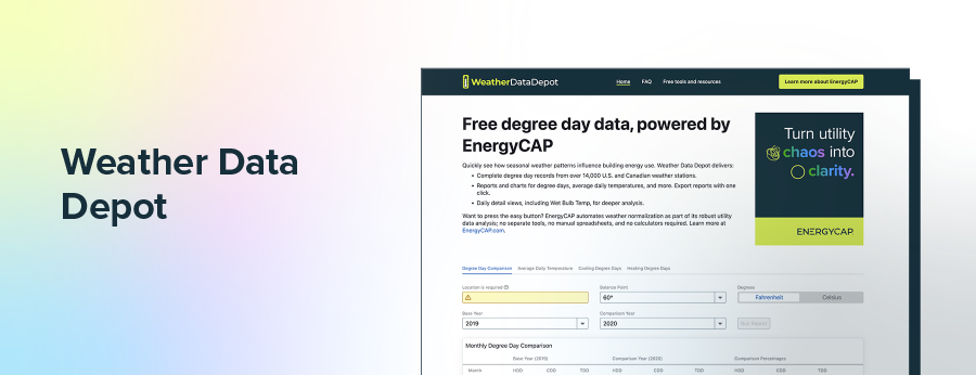 Weather Data Depot is a free web tool for quick heating and cooling degree day analysis. It pulls historical daily temperatures, rolls them into HDD and CDD totals. It lets you compare seasons across thousands of U.S. and Canadian weather stations. You can use it to explain weather‐driven variance, normalize utility use, and support budgets and forecasts.