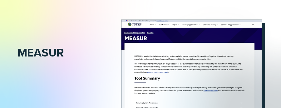 MEASUR is a free, open-source suite from the U.S. Department of Energy that helps industrial teams identify, assess, and quantify energy savings across core systems. These systems include pumps, fans, steam, process heating, motors, compressed air, lighting, and wastewater treatment. It offers a growing library of assessments and more than 40 built-in calculators for quick engineering estimates.