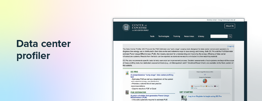 Data center profiler (DC Pro) is an early-stage scoping tool from Lawrence Berkeley National Laboratory and the DOE; it helps data center teams diagnose energy use and identify where to save. It estimates current and potential Power Usage Effectiveness (PUE), shows energy-use distribution across systems, and is not intended as an investment-grade audit.