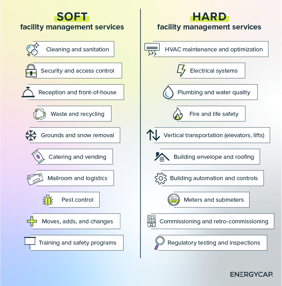 Facility management services are often grouped into two buckets: soft services that support people and operations, and hard services that maintain the building and its systems. Clear scope and ownership prevent gaps, improve budgeting, and make performance easier to measure, helping organizations achieve cost avoidance.